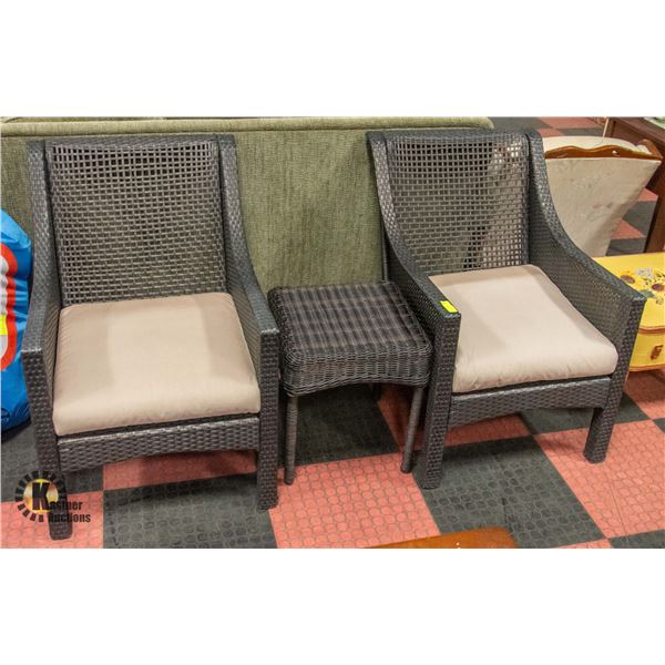Description. Enjoy a quiet conversation, coffee or book with the Latigo 3-Piece Rattan Patio Chat Set from Threshold™. Two cushioned wicker chairs support you on sturdily woven frames that are as easy to style around as they are comfortable. The round wicker coffee table with glass top moves around easily, so you can set it up in your.