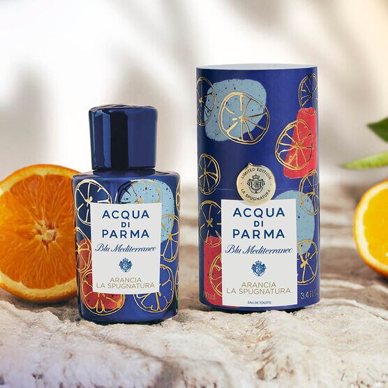Packaged in a navy blue porcelain bottle, a signature of the Blu Mediterraneo collection, the bottle is hand-crafted with orange, gold and white motifs. A variation on Acqua di Parma's 1999 Arancia di Capri and following, more recently, Bergamotto di Calabria La Spugnatura.
