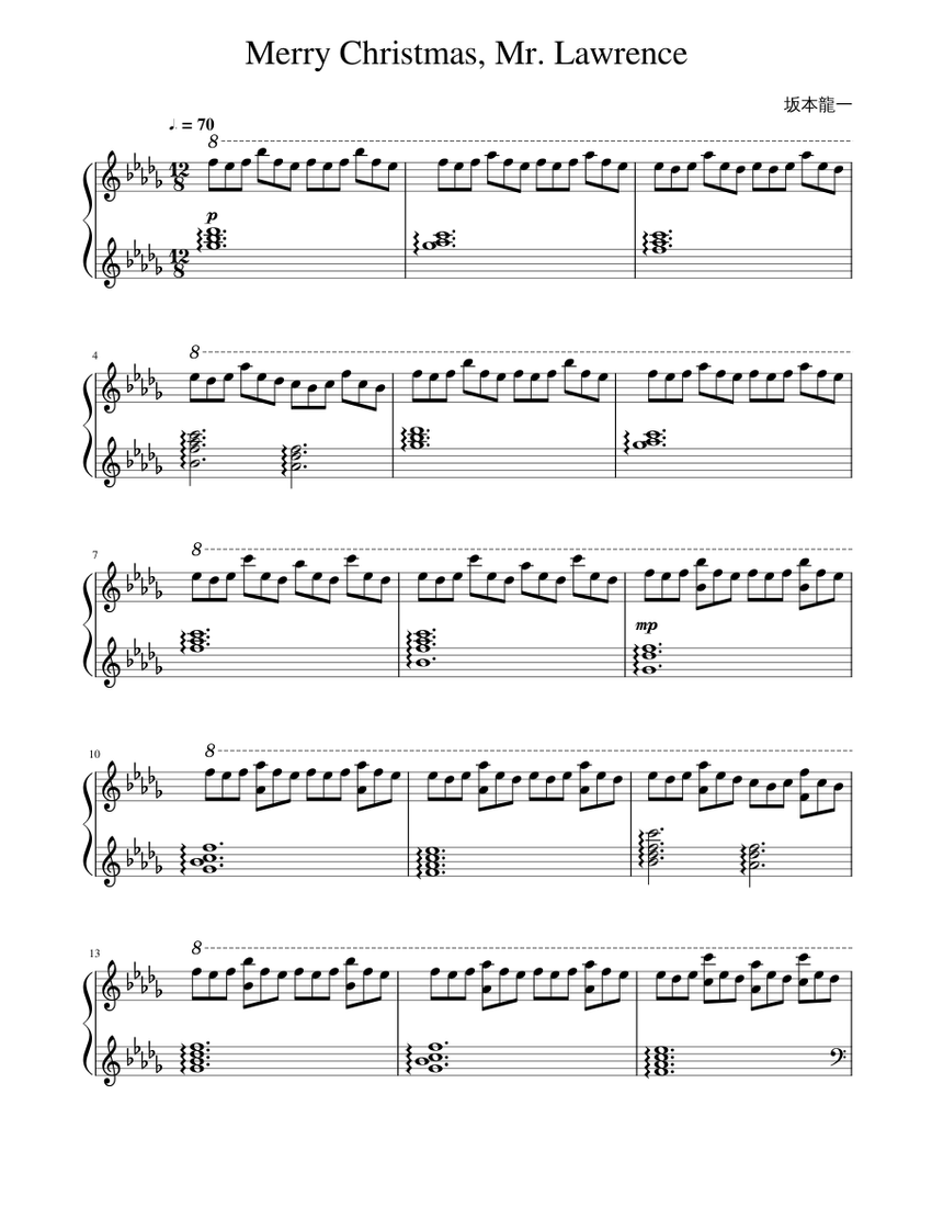 Get Merry Christmas, Mr. Lawrence sheet music by Sakamoto as a digital notation file for Piano/Keyboard in DB Major (transposable). Arranged by Jacob Koller. Download, print, transpose, and more. This is an advanced solo piano arrangement of this beautiful piece by Ryuichi Sakamoto.