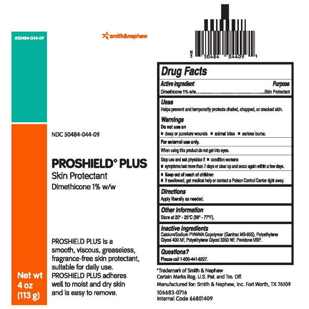 Material name Proshield Plus Skin Protectant CAS # Mixture DIN Number: 02256975 NDC Number 50484-044-09 ReorderNumber: 0064030004, 0064031004, 8213030004 MSDS Number SNFT-MSDS-011 Product use Skin Protectant. Manufacturer/Supplier Smith & Nephew Inc. 3909 Hulen Street Fort Worth, TX 76107 Contact: 1-800-441-8227 2.