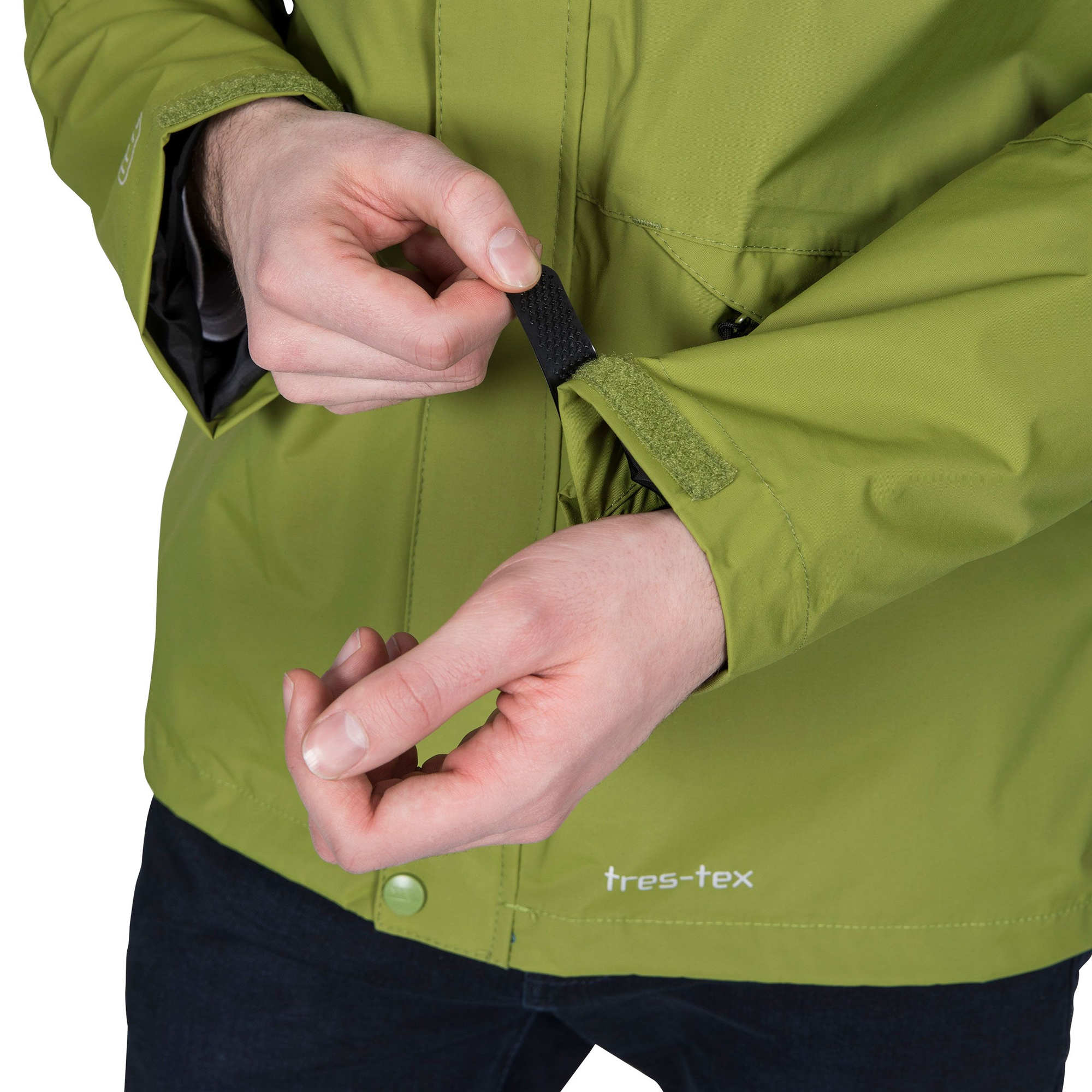 Product Description. Mens Trespass Corvo Hooded Waterproof Jacket in Black- Zip fastening- Waterproof - 5000mm- Breathable - 5000MVP- Windproof- Taped seams- Hook and loop storm flap- Popper button to top and bottom- Zip pockets to sides with storm flaps- Zip pocket to chest- Tres-tex - Raglan sleeves- Inner zip pocket- Hook and loop adjustable.